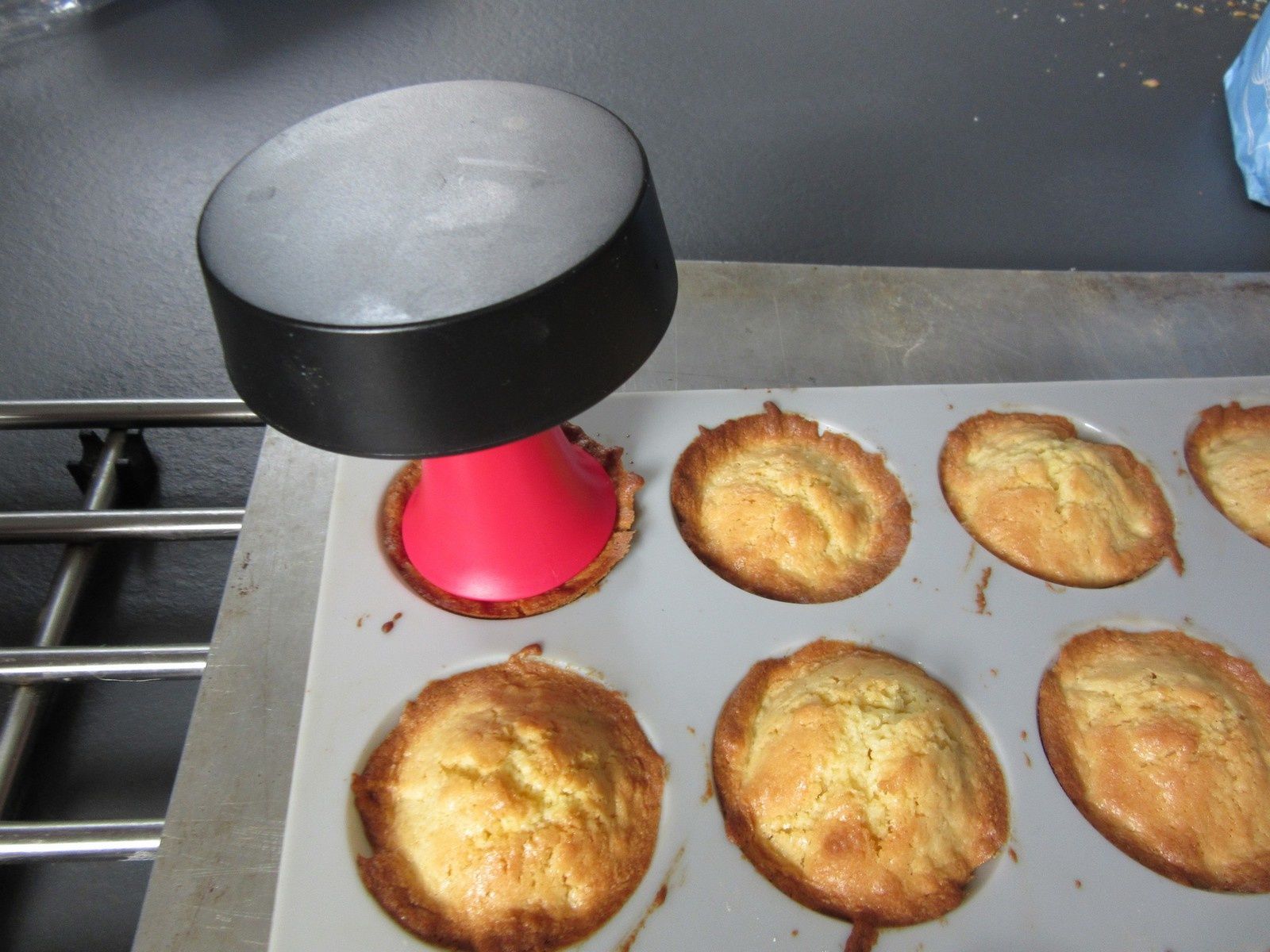 Verser dans vos empreintes garnies (soit à la poche à douille ou si comme moi vous avez la flemme de la sortir, à la cuillère (ou plutôt, je prends deux cuillères car la deuxième est là pour récupérer le caramel qui pourrait couler).