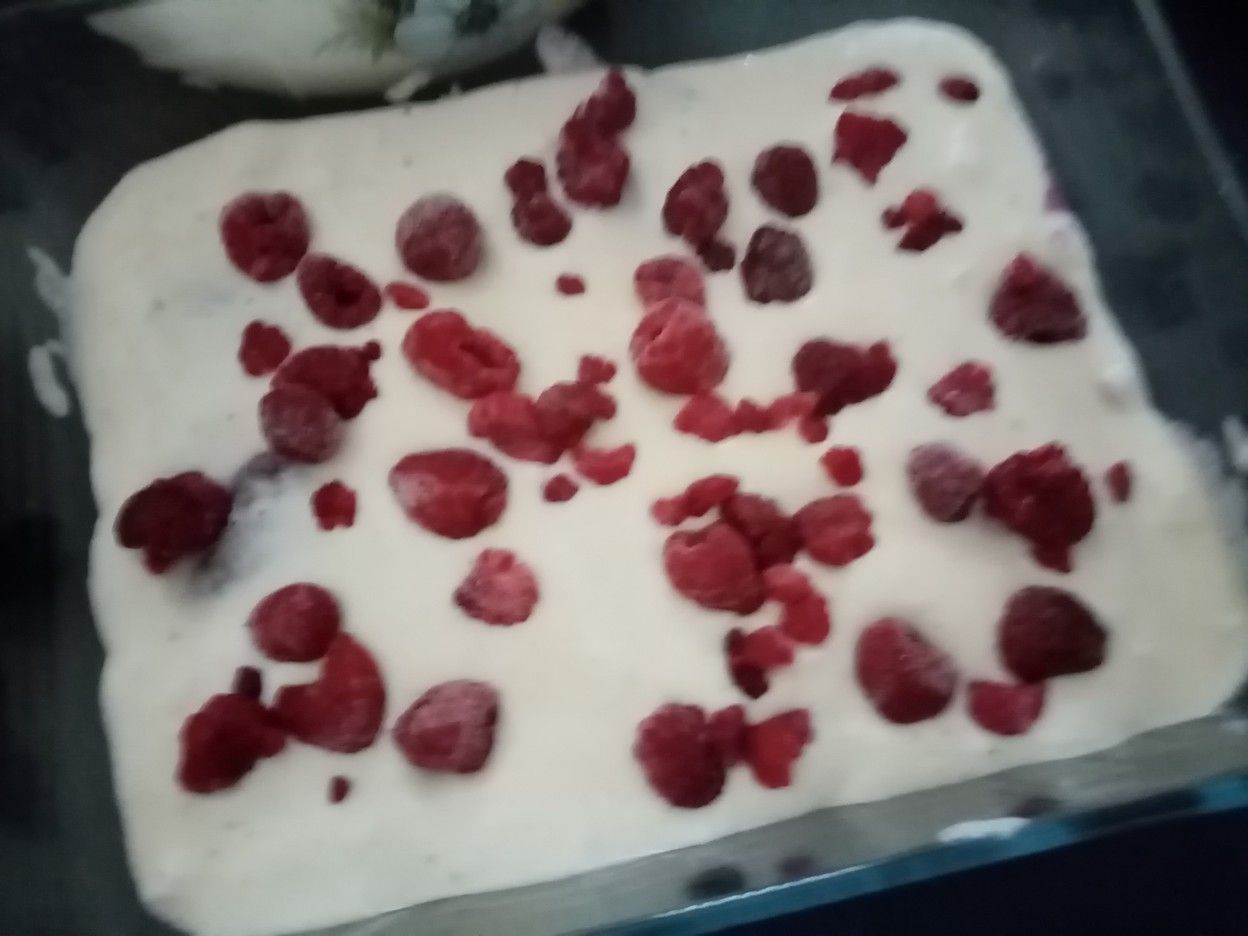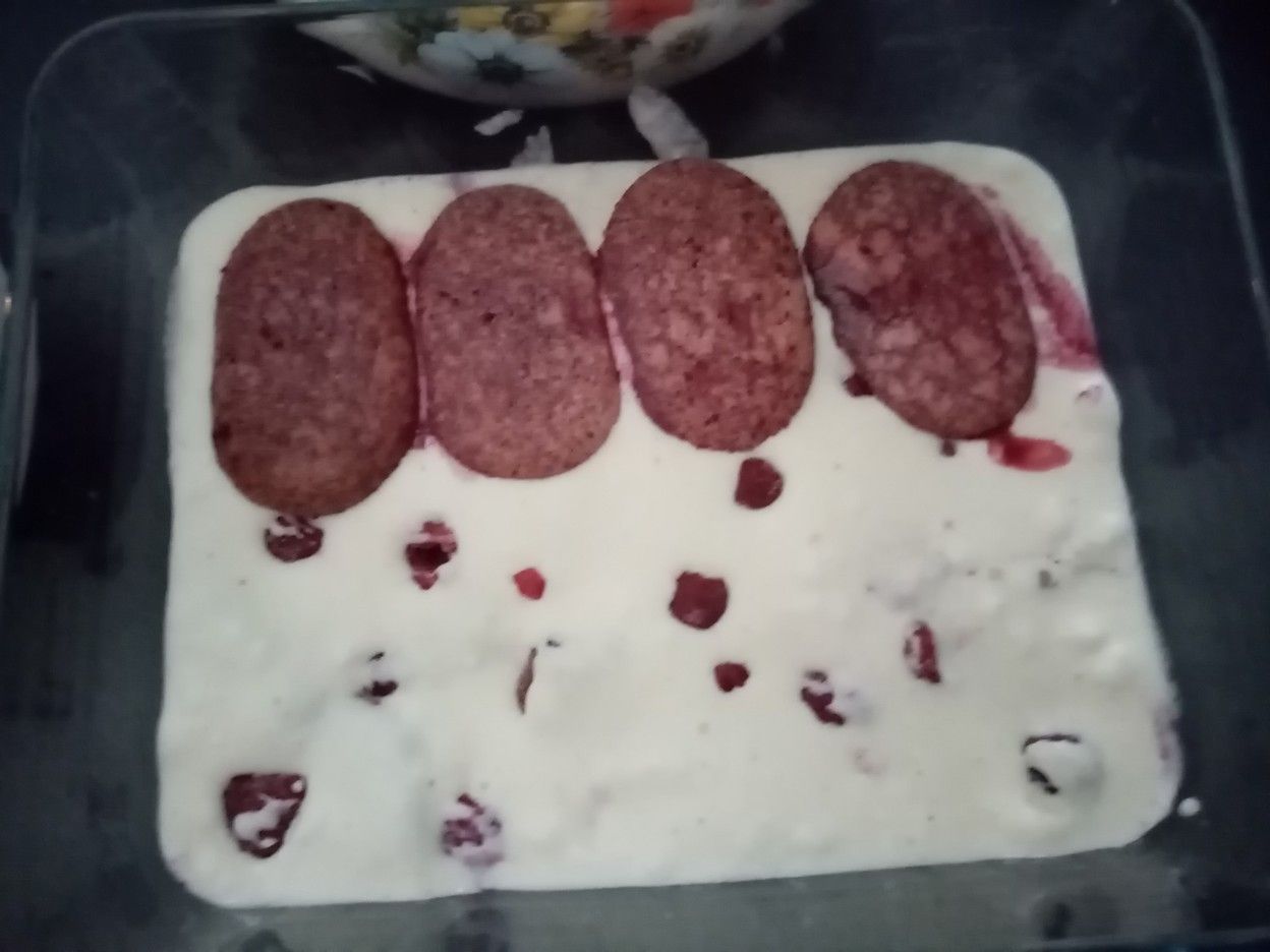 Imbiber les biscuits dans le sirop de framboise (il faut être rapide car il ne faut pas qu'ils soient gorgés de liquide, juste légèrement imbibés)