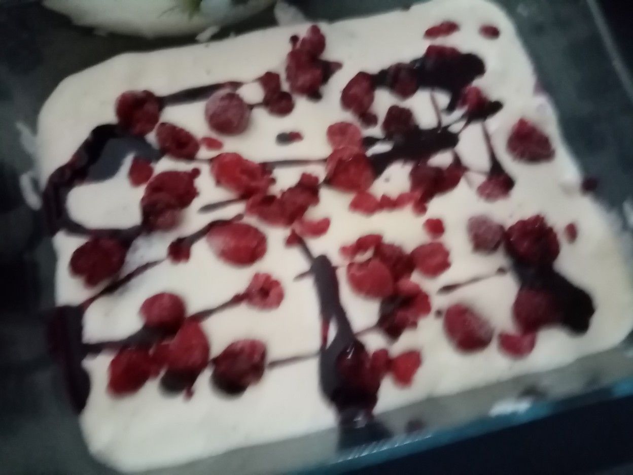 Pour finir, mettre au choix: des biscuits roses émiettés, des framboises entières, du coulis ...