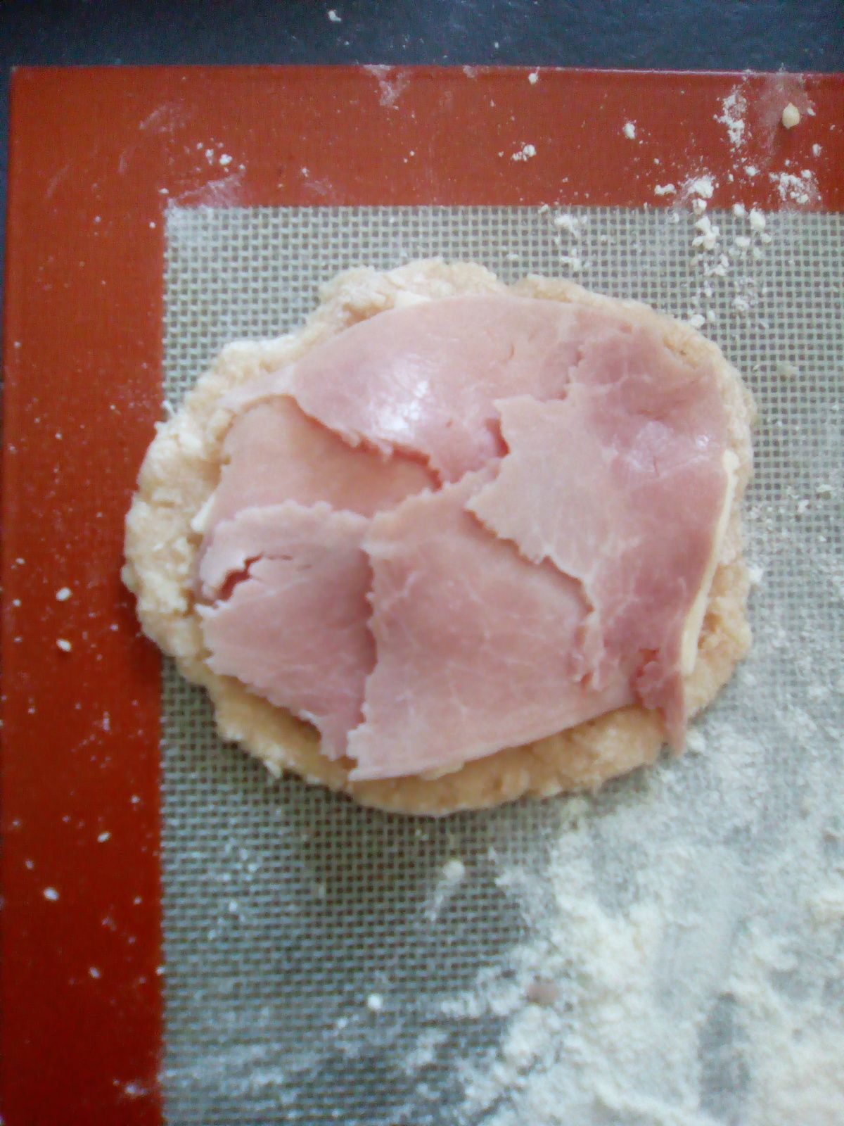 Sur le premier disque, déposer une tranche de fromage, une demi tranche de jambon (sans aller jusqu'au bord), si vous êtes gourmand et que vous voulez un cordon bleu bien garni, remettez une tranche de fromage et une autre demi tranche de jambon. Il n'est pas obligatoire que les tranches restent entières, on peut découper des morceaux pour mieux épouser la forme de la pâte.