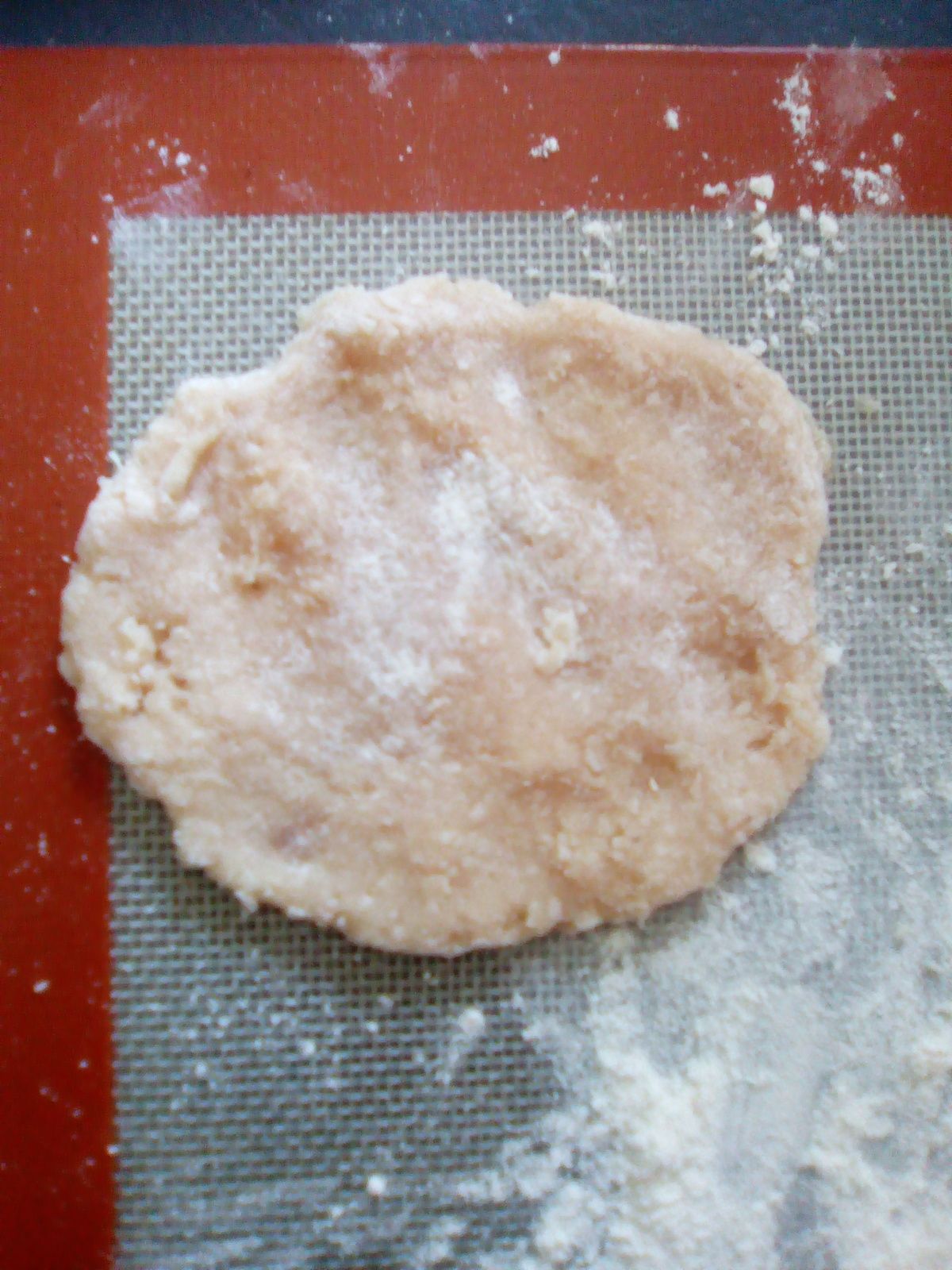 Rouler chaque boule de pâte dans la farine, la diviser en deux et l'étaler en deux disques, on peut utiliser un emporte pièce mais je ne l'ai pas fait. Il faut bien fariner ses mains et le plan de travail pour faciliter la réalisation.
